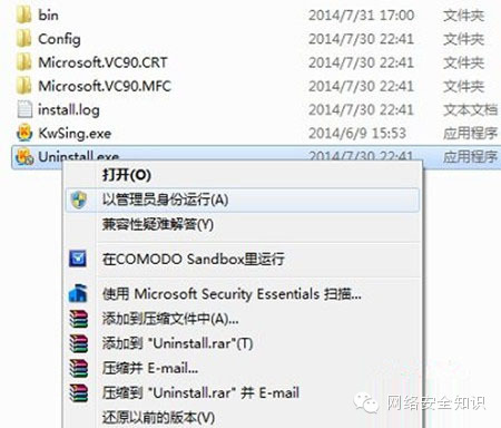 第一步、大家打开软件安装目录,找到软件卸载程序,一般名称为Uninstall.exe,也有可能是含“卸载”的中文软件。我们右键该程序,选择“以管理员身份运行”。