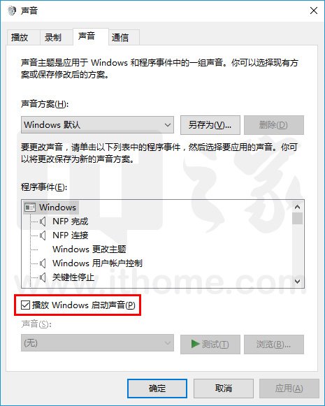 ▲在Win10声音设置中,勾选“播放Windows启动声音”后,重启会听到熟悉的开机音乐