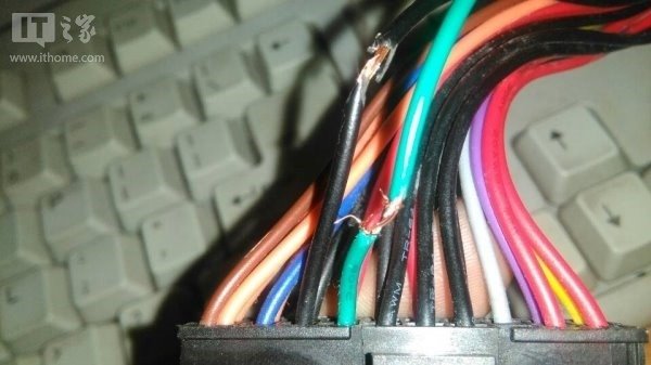 4、在昨天的教程里解释过在电源的20PIN的主板插头上绿色的PS_ON信号线和黑色的地线(没看过的小伙伴可以点此链接),现在找到两个电源的20PIN的主板插头上各自的绿色的PS_ON信号线和黑色的地线;