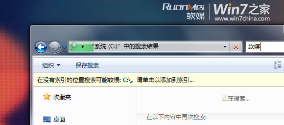 在使用 Windows 7时,我们会发现在某些文件夹中进行搜索时,速度像XP 那样很慢,要经过漫长的等待才能得出结果。那是因为Windows 默认只为库文件夹、开始菜单、上网历史记录、电子邮件等内容制作索引,对于没有制作索引数据的文件夹,Windows 只能一点一点搜索文件的属性或内容,最终找到用户想要的结果,效率就会低很多: