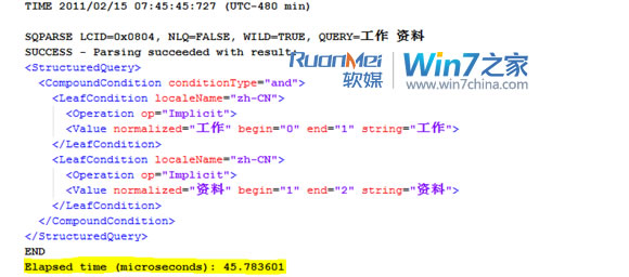 如图中所示,Elapsed time (microseconds): 45.783601 表示上面的操作执行了 45.783601毫秒,也就是0.045秒钟,看来,Windows 的搜索速度同样是很快的。这都得益于Windows 搜索功能为硬盘中的文件制作了索引,就像字典中的查字表,通过它可以很快的得到要找的字的位置,而不需要在字典中一页一页的翻阅。