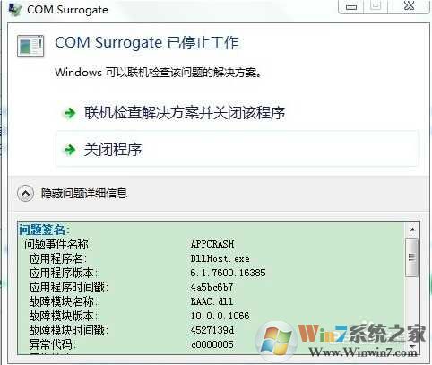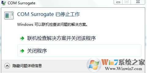 1、出现com surrogate已停止工作提示后不要关上,点击查看问题详情;