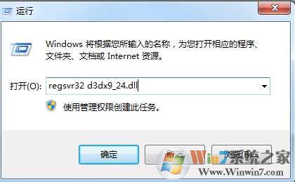 二、然后打开“开始-运行-输入regsvr32 d3dx9_24.dll”,回车即可处理错误提示。