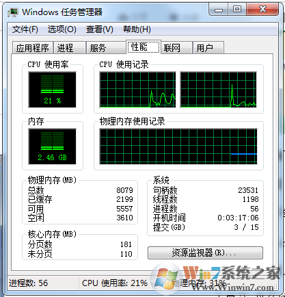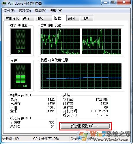 3、如果这个进程占用cpu是有波动性的,你们就在性能里面,你们可以监视CpU的使用率。打开资源监视器。然后将一直占用CpU比较高的进程关上,查看到底是哪个进程或者程序使用CpU资源。