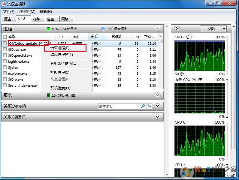 3、找到CpU使用率高的进程或需要配置的进程,并鼠标右键菜单“配置关于性”选项;