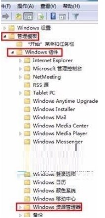 2、在编辑器中依次展开“用户设置—管理模板—windows组件—windows资源管理器”;