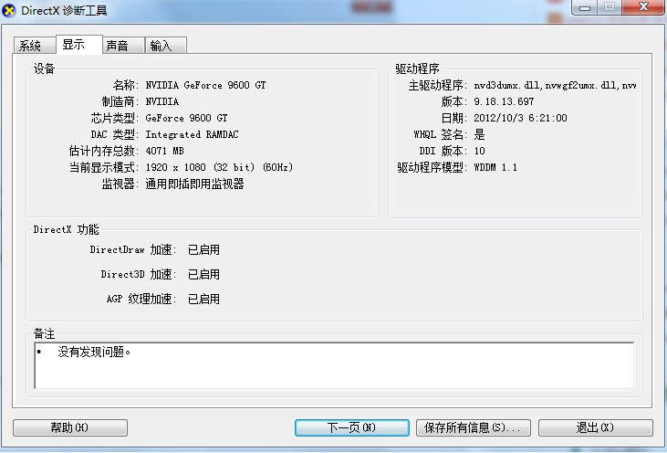 2、再次 同时按下win+R键,在运行窗口输入dxdiag,回车,即可出现下图这个界面,各位亲就能在下图中找到自己所需要的各种有相关自己电脑的信息了