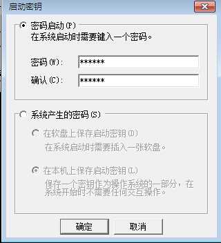 4、在出现的“启动密钥”窗口,点选“密码启动(p)”,在“密码”和“确认”输入框中输入系统启动密码,输入完毕后点击“确定”,如图4所示: