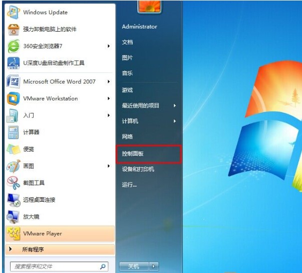 1、点击在电脑屏幕左下角的“开始”菜单,选择“控制面板”选项。如下图所示: